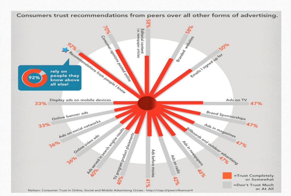 92% of consumer choice comes from people they know. Only 33% - 47% of consumer choice is impacted by typical advertising schemes, ads on TV, mobile phones, etc. However, top decision impacts come from what other people are saying about you. Has this convinced you that your business should have an online presence yet? Specifically a presence on Social Media. You no longer need to be pushing your product as much, you will have 'Brand Advocates', your friends and loyal customers, selling your product for you.